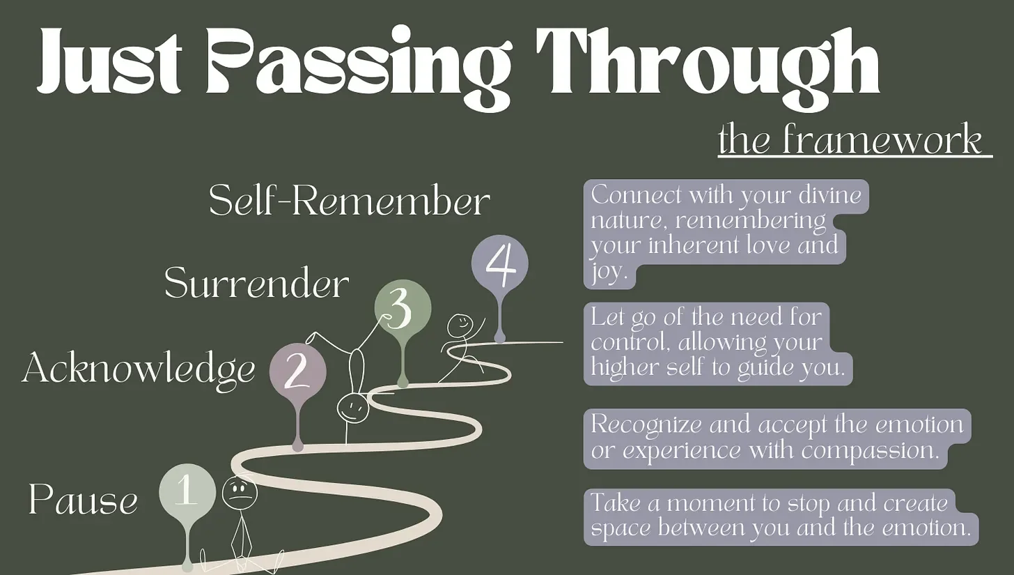 In the middle of the storm, remember your divinity. Remember who you truly are: an infinite being with an eternal soul, rooted in love and joy. This step is about connecting with your higher truth, remembering that no matter what is happening externally, you are whole, you are love, you are joy. When you self-remember, the fleeting nature of discomfort becomes clear, and you stand firm in your unshakable worth.